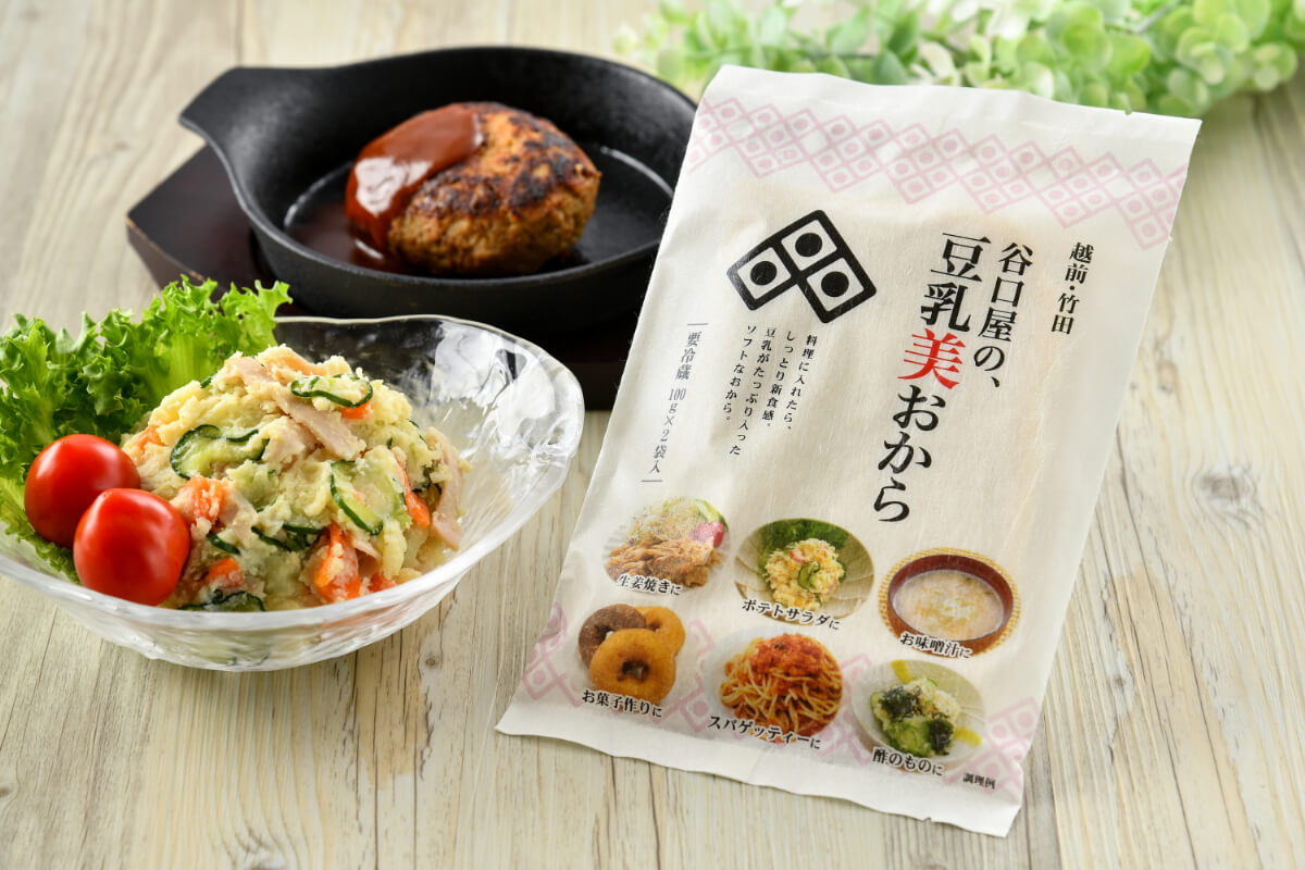 工場からとれたてのおからに自家製豆乳をたっぷり入れて、しっとりとさせました。ポテトサラダなどにそのまま混ぜてお使いください。お菓子作りにもオススメです。